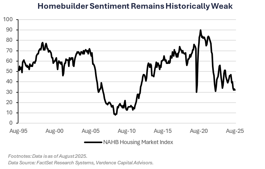 Consumer borrowing increased in July by the most in three months as revolving debt (i.e., credit cards) posted its largest gain in balances for the year. Revolving debt increased a total $10.5 billion for the month driven by sales at online retailers specifically. The share of U.S. consumer debt in “serious delinquency” increased in 2Q25 to the highest level since early 2020 driven by the restarting of payments for student loans.